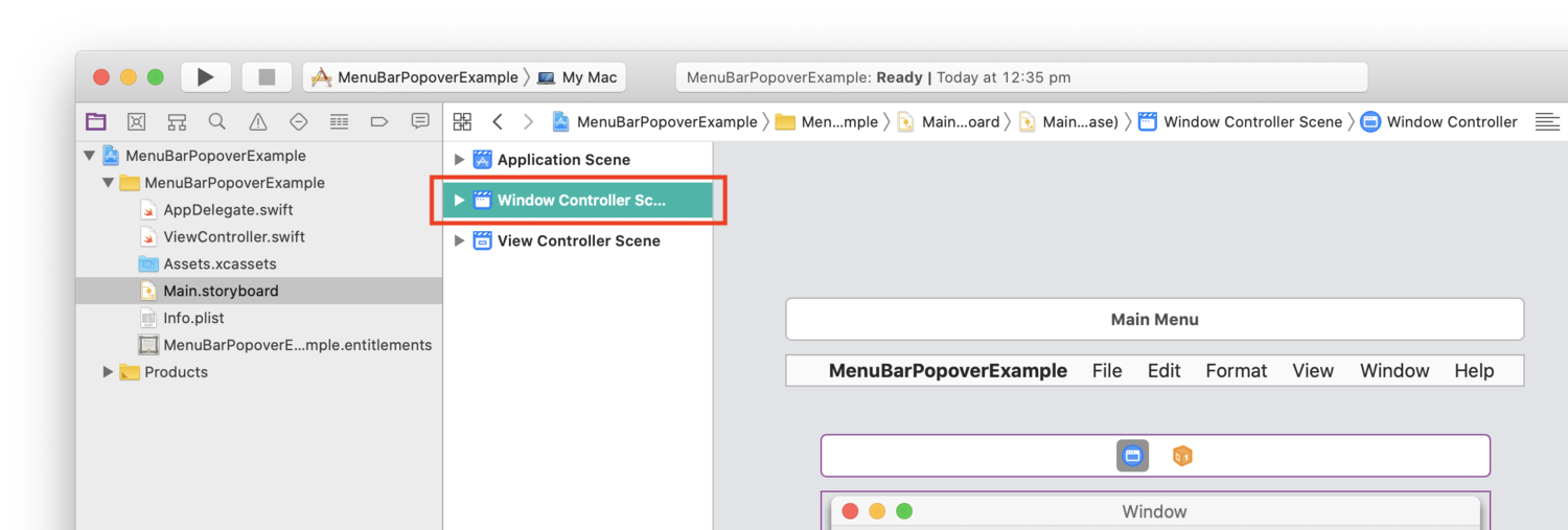 To be a proper menu bar app, the interface should only be accessible from the menu bar. To archive this we need to hide the dock icon and main window. First, simply open the Main.Storyboard file of the project then select and delete the Window Controller Scene (not the View Controller Scene). This will prevent the main window from displaying.